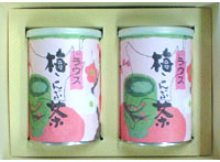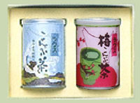 ケース詰には、2缶詰ケース、3缶詰ケース、6缶詰ケースの三種類があります。梅昆布茶を組み合わせても同価格です。こんぶ茶2缶詰ケース